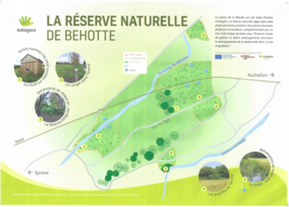 La réserve naturelle de Behotte à Rochefort méritait bien son aire didactique vu son emplacement privilégié le long du RAVel ! Elle reprendra une description des différents milieux que l’on retrouve dans cette réserve naturelle. Elle comprendra un panneau général de type panneau d’accueil et 5 panneaux de type « lutrin » pour les descriptions des milieux comme « Un HLM pour les chauves-souris », « Le verger », « La réserve intégrale », « Les prairies de fauche » et « La mare ».