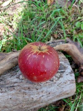 Le fruit est une pomme rouge lie de vin sur fond vert, grande, ronde, à peau lisse et légèrement grasse. La chair est blanche d'apparence verte au niveau de la mouche. Il se récolte en octobre.